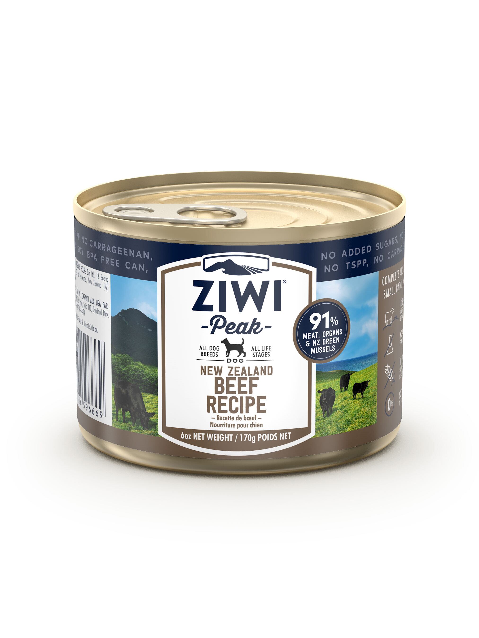 ZIWI Peak ドッグ缶ウエットフードは子犬からシニア犬まで全ライフステージに対応したバランスの取れた総合栄養食です。肉・内臓・魚介類・骨を91%使用し、さらに10%のスーパーフードを配合。穀類、ジャガイモ、グリセリン、レンダリング肉やミールは不使用です。主食としてはもちろん、栄養価の高いトッピングや美味しいおやつとしてもご利用いただけます