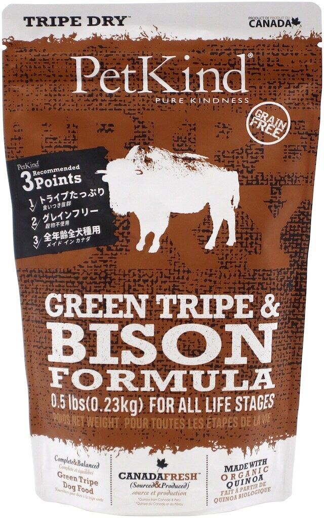 犬にとって最も嗜好性の高い食材の一つであるトライプ(反芻、草食動物の胃)を第一主原料として使用したドライフード。トライプには独特の臭いがありますが、TRIPE DRY(トライプドライ)フードはトライプの臭いが気にならず与えやすいのが特徴。グリーントライプ&バイソン、グリーンビーフトライプ、グリーンラムトライプ、グリーントライプ&ワイルドサーモンの計4種のフードをローテーションするのもお勧め。
