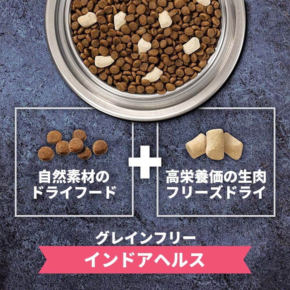 チキン、チキンミール、サーモンミール、エンドウ豆、メンヘーデンフィッシュミール、タピオカ、チキン脂肪(混合トコフェロールとクエン酸で保存)、 サンドライアルファルファミール、フリーズドライチキン、ドライトマトポマス、ナチュラルフレーバー、フリーズドライチキンレバー、フルク トオリゴ糖、カボチャの種、乾燥チコリの根、モンモリロナイトクレイ、ビタミン(ビタミン E サプリメント、ナイアシンサプリメント、L- アス コルビル -2- ポリリン酸塩、チアミン硝酸塩、d- パントテン酸カルシウム、ビタミン A サプリメント、リボフラビンサプリメント、ピリドキシン塩酸塩、 メナジオン重亜硫酸ナトリウム複合体、ビタミン B12 サプリメント、葉酸、ビタミン D3 サプリメント、ビオチン)、フリーズドライチキンハート、塩、 ニンジン、リンゴ、クランベリー、塩化コリン、塩化カリウム、ミネラル(亜鉛タンパク質、鉄タンパク質、銅タンパク質、マンガンタンパク質、 亜セレン酸ナトリウム、エチレンジアミン)、DL- メチオニン、ユッカシジゲラ抽出物、タウリン、乾燥昆布、サーモンオイル、ブルーベリー、乾燥乳酸菌バチルス・コアギュランス、ローズマリーエキス